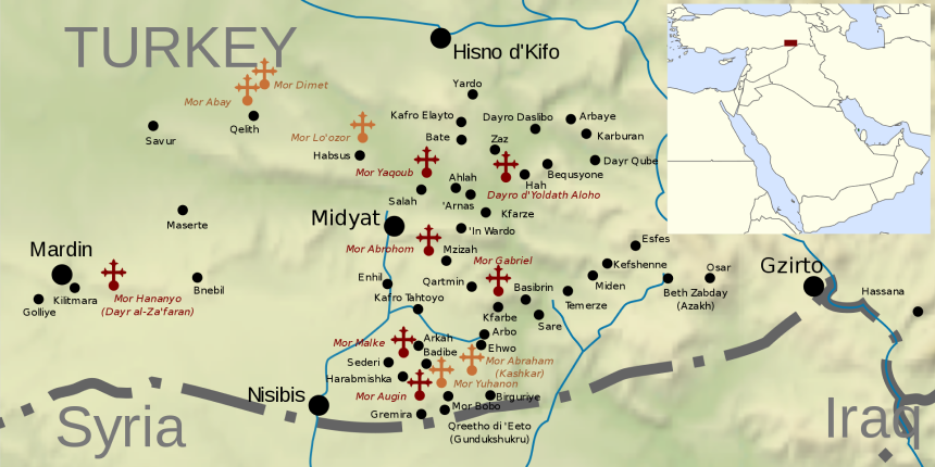 Mapa de Tur Abdin que muestra los principales pueblos y monasterios en funcionamiento (oscuro) y abandonados (claro). Wikimedia. Publicado bajo licencia Creative Commons.